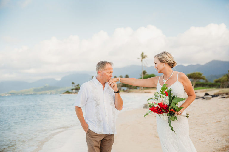 They planned their Hawaiian elopement beautifully. They stayed at the Paradise Bay Resort in Kaneohe, just across the small bay from their wedding ceremony. The caring staff at Paradise Bay helped Tracy pick her own flowers from around the grounds which she used to make her own tropical bouquet. And we drove just a little farther north to the beautiful Kualoa Beach Park. It had been such a rainy month and we hadn’t had much sunlight on the windward side in what seemed like forever. But just as we got to the beach park, these stunning rays of vibrant sunlight skimmed over the tips of the Koolau mountains. It was a gorgeous backdrop for Hawaiian wedding photos.